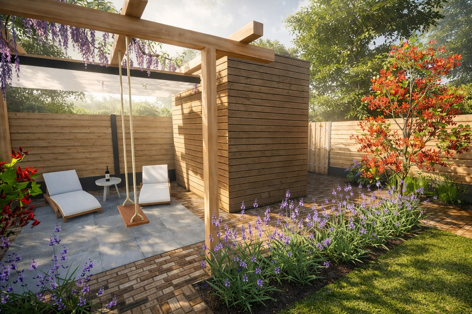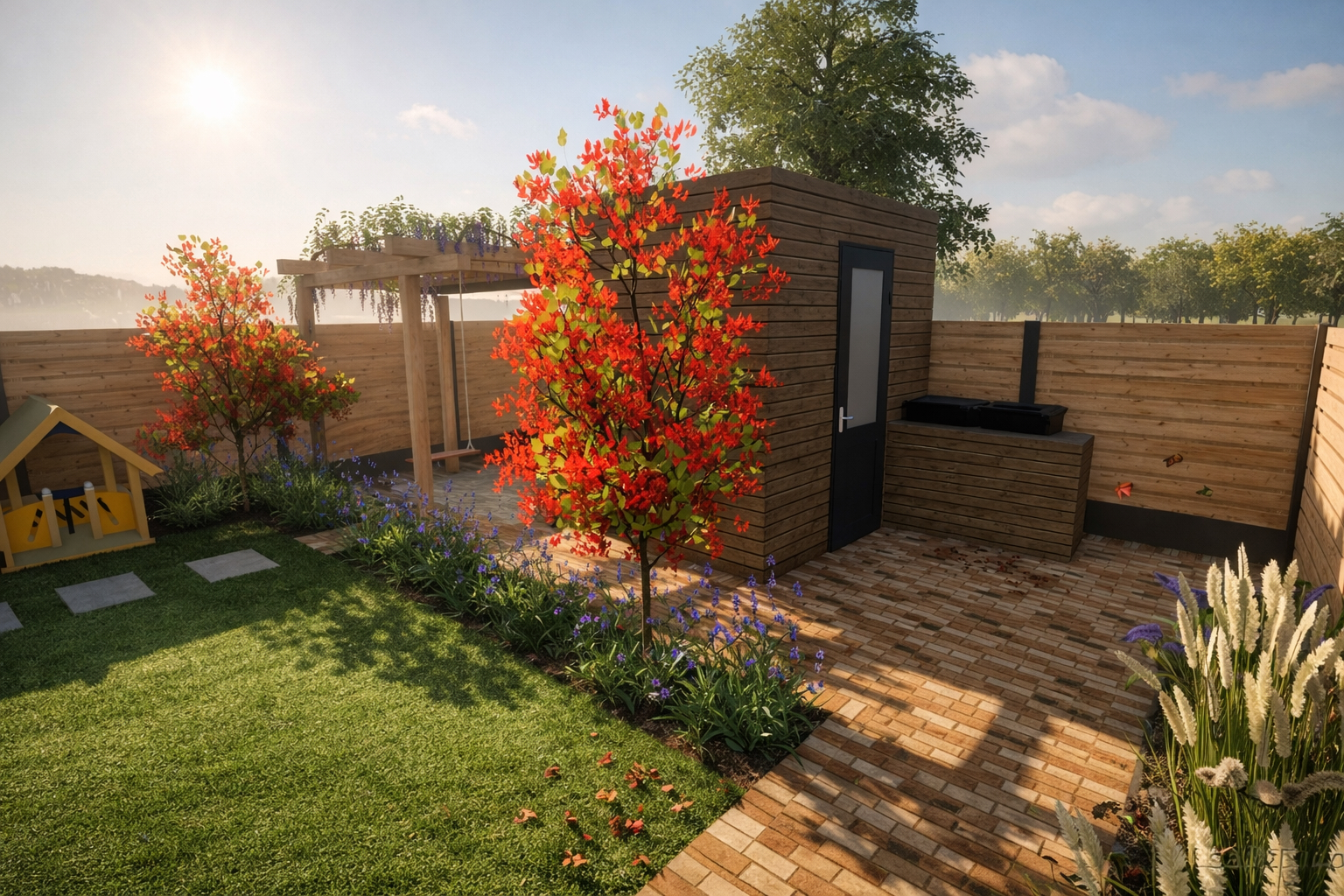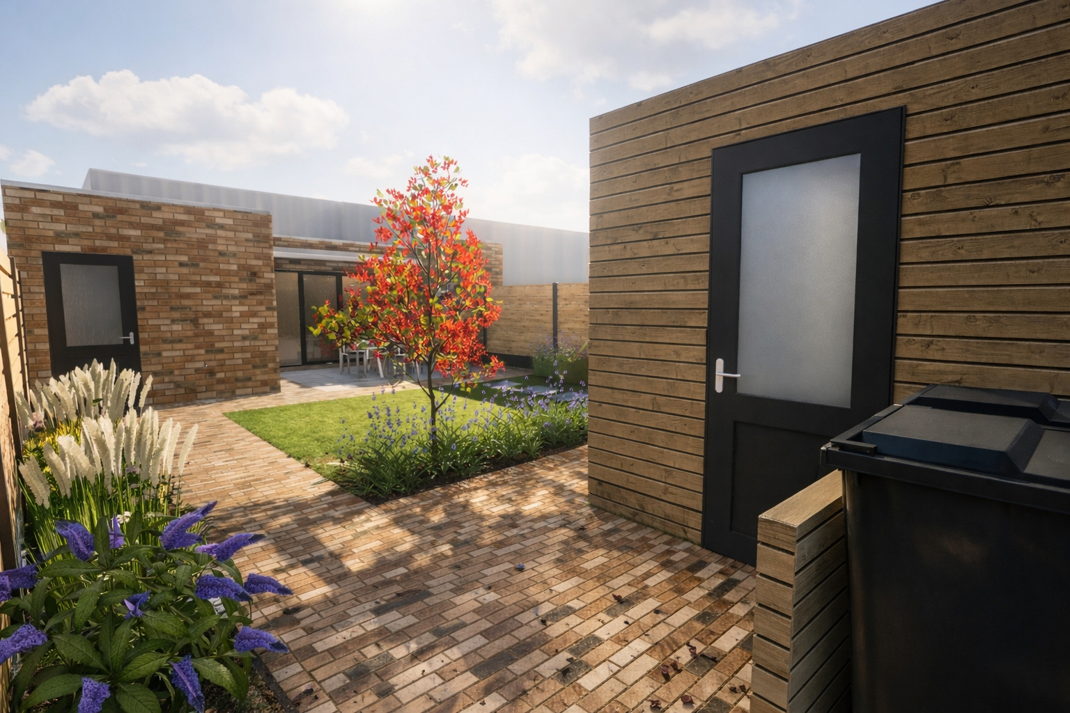 Nieuwe bewoners van Lage Heide in Dommelen vroegen Versleeuwen Design om hun tuin vorm te geven. Met veel enthousiasme heb ik een doordacht ontwerp gemaakt en dit realistisch gevisualiseerd, zodat zij hun toekomstige tuin al konden beleven vóór de realisatie.